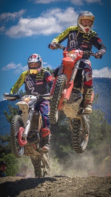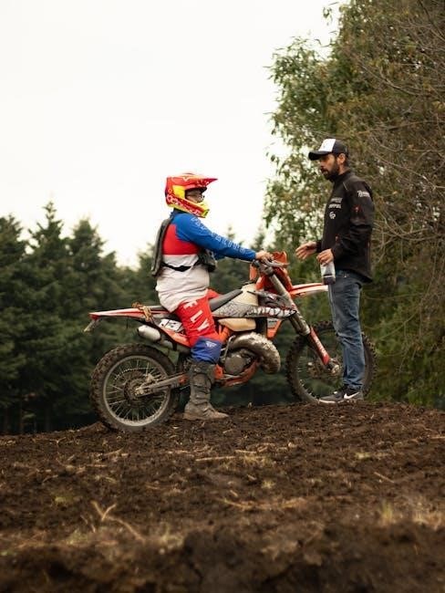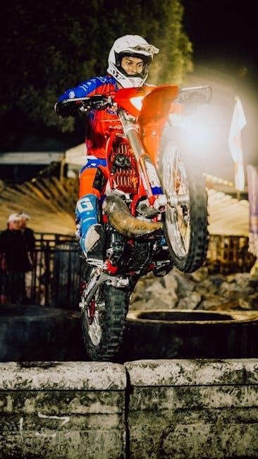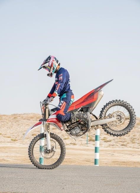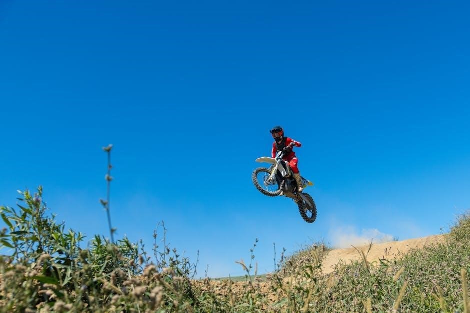 The manual details techniques for navigating obstacles like logs and rocks, advocating for controlled momentum and precise throttle control. It stresses the importance of using body weight to shift the bike’s balance and maintain traction. Hill climbing requires a focused approach, utilizing engine braking and clutch control.